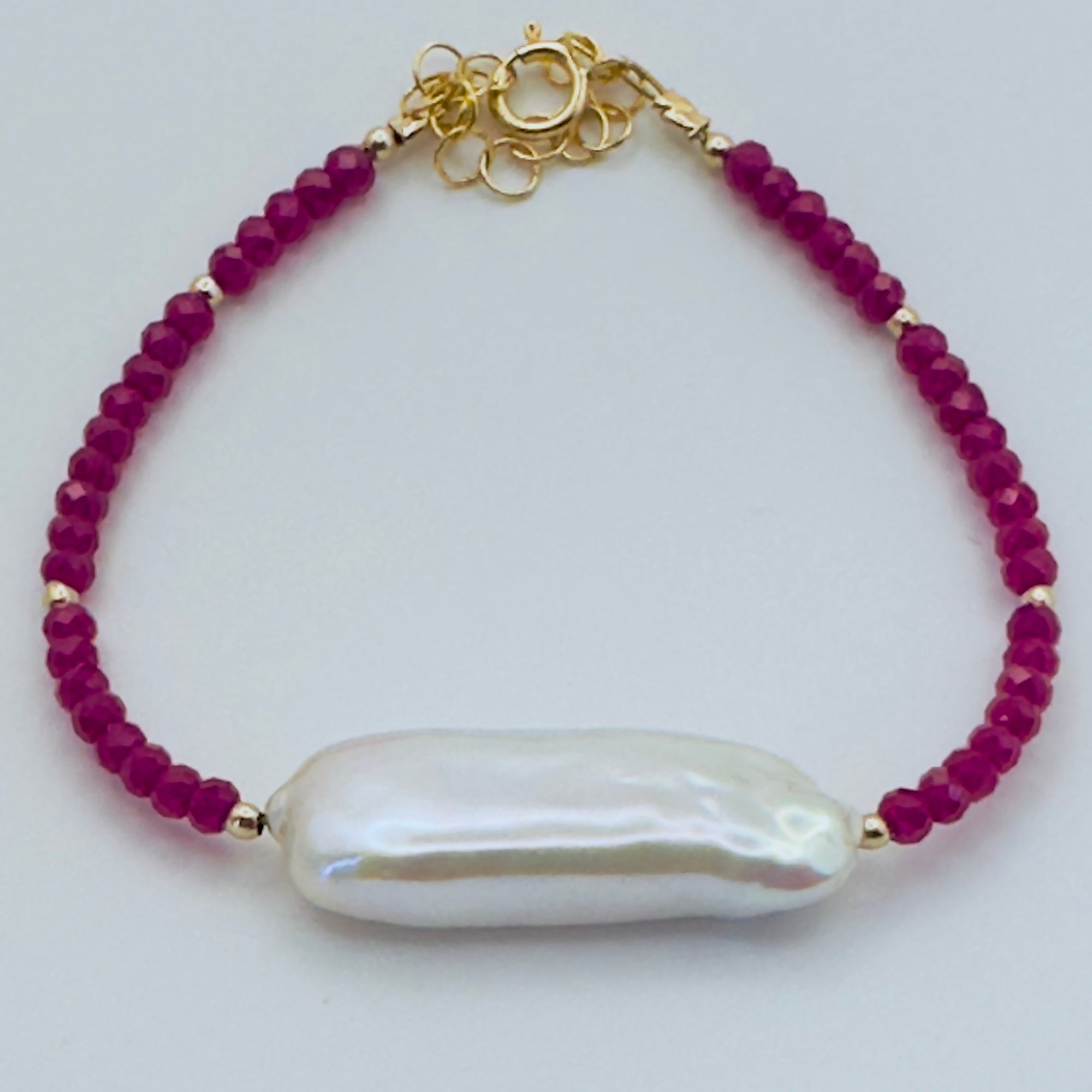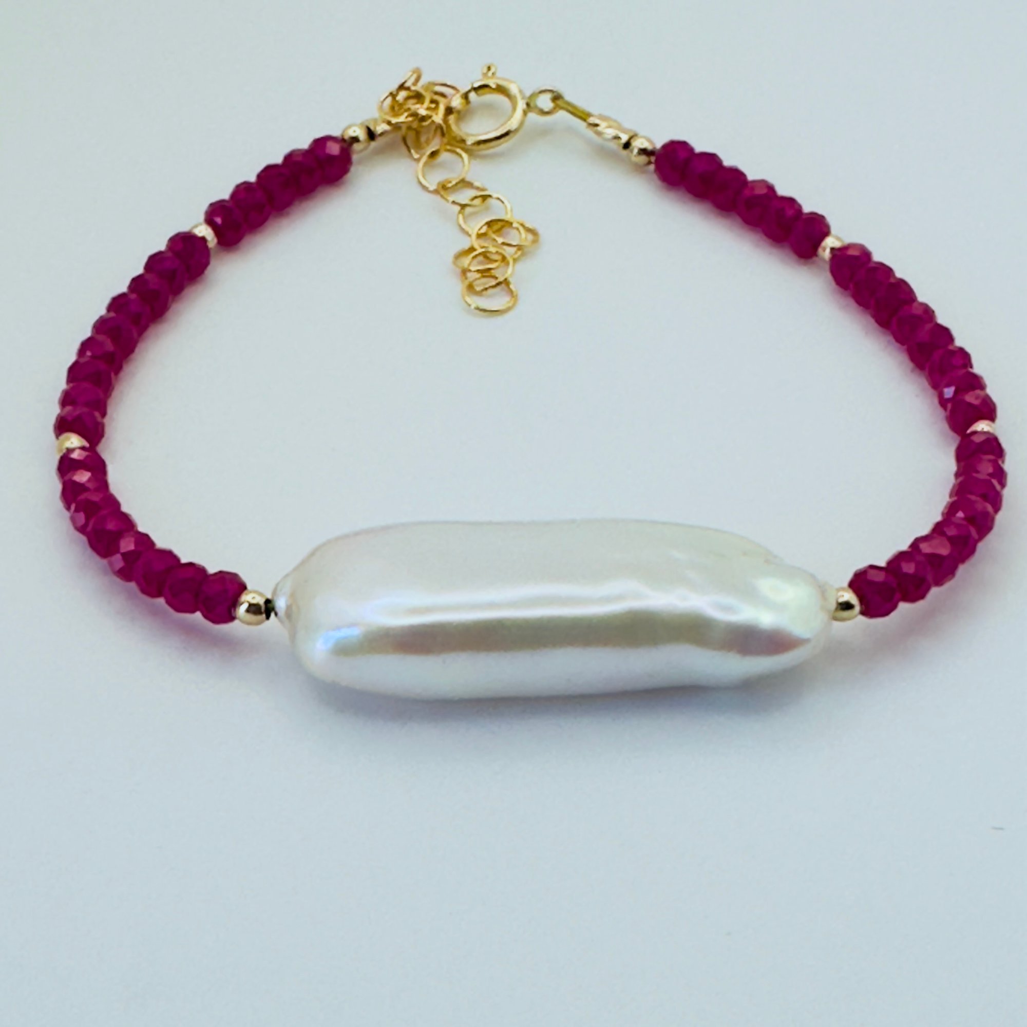 Pearl rectangular 3x1 centimeters , Ruby 3mm, Gold filled, 1 inch extension