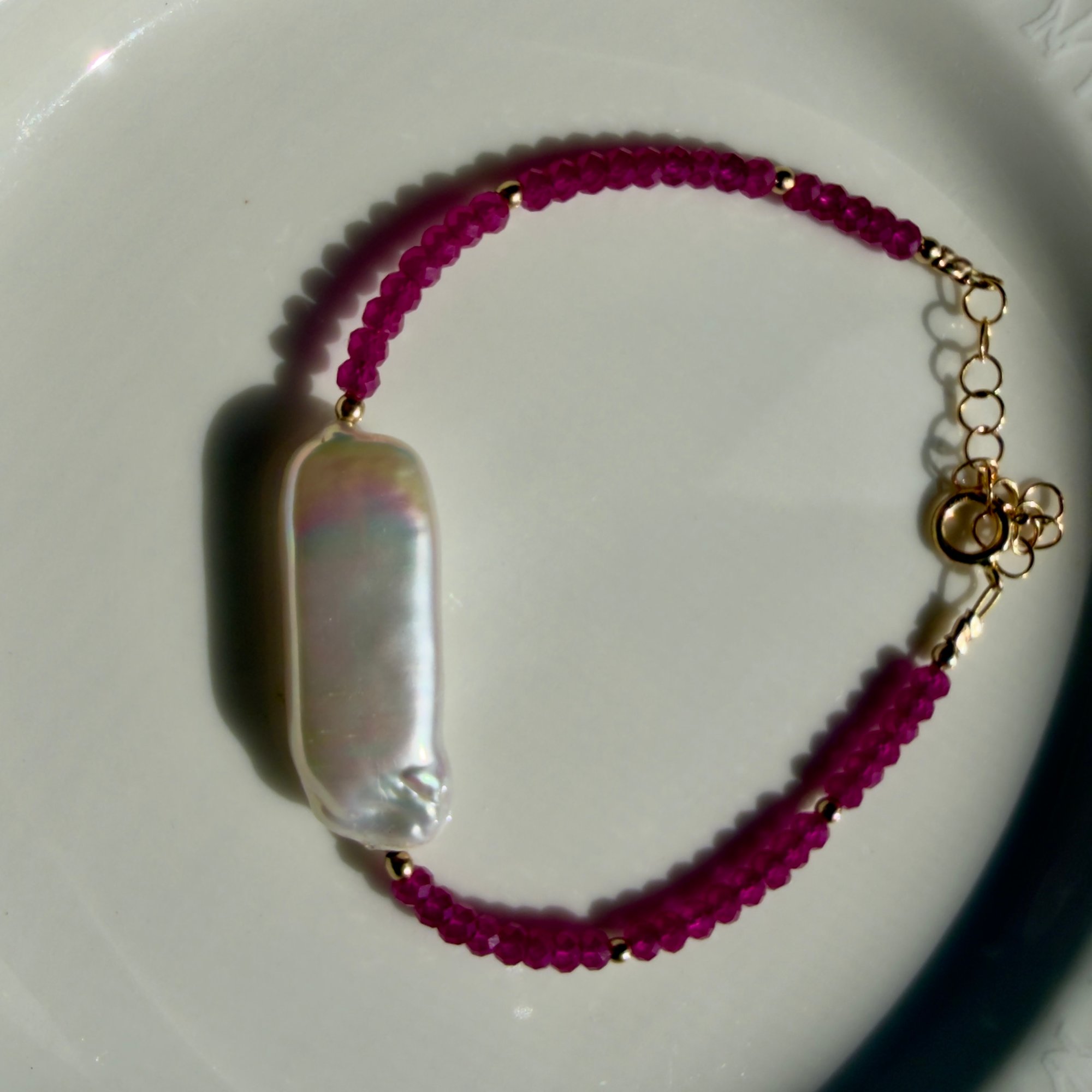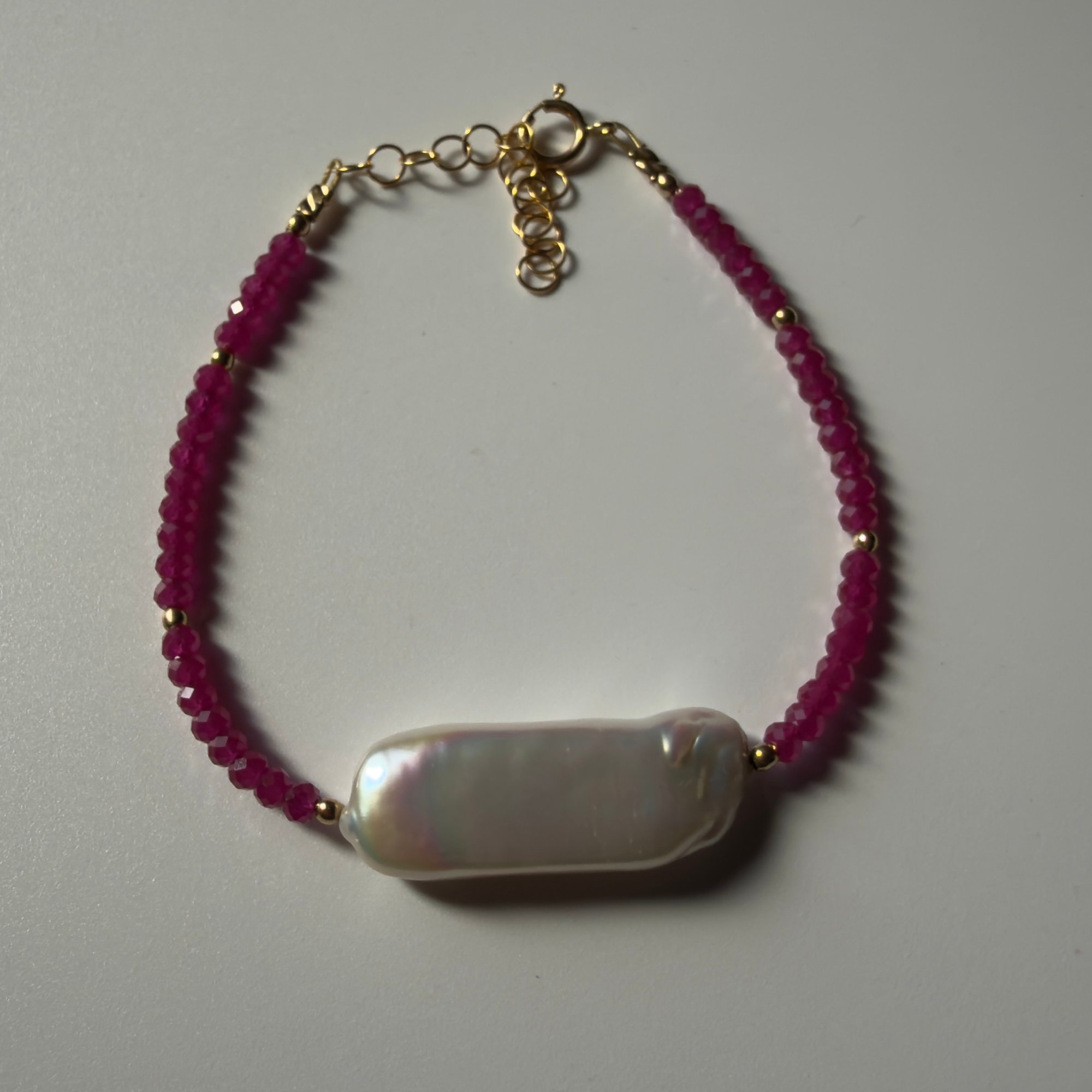 Pearl rectangular 3x1 centimeters , Ruby 3mm, Gold filled, 1 inch extension fits 6.-7.5 wrist