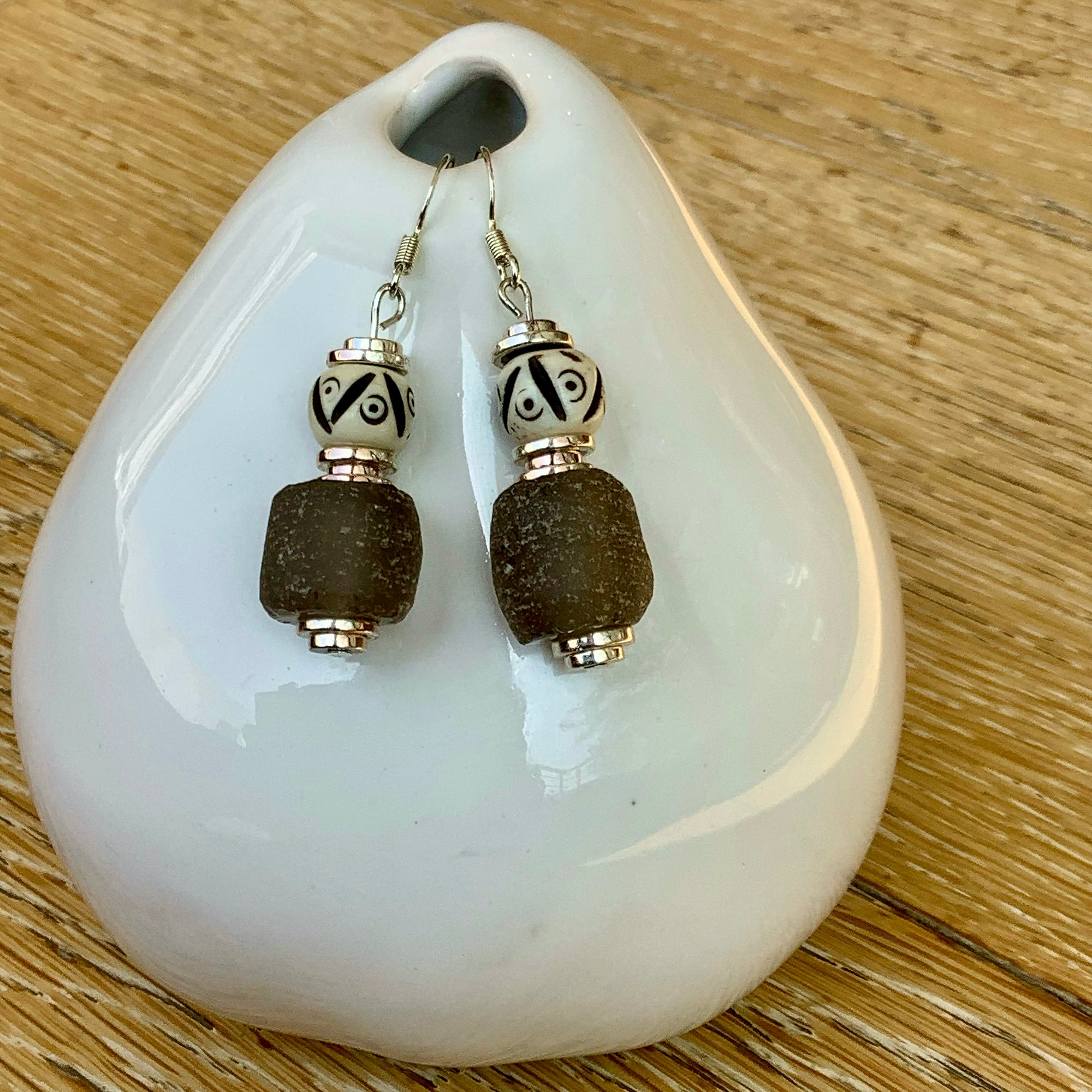 Grey cylindrical 12mm java recycled glass bead, criss cross eye mala bone 8mm bead . Aprox 1 1/4 inches long . Earwire ss.