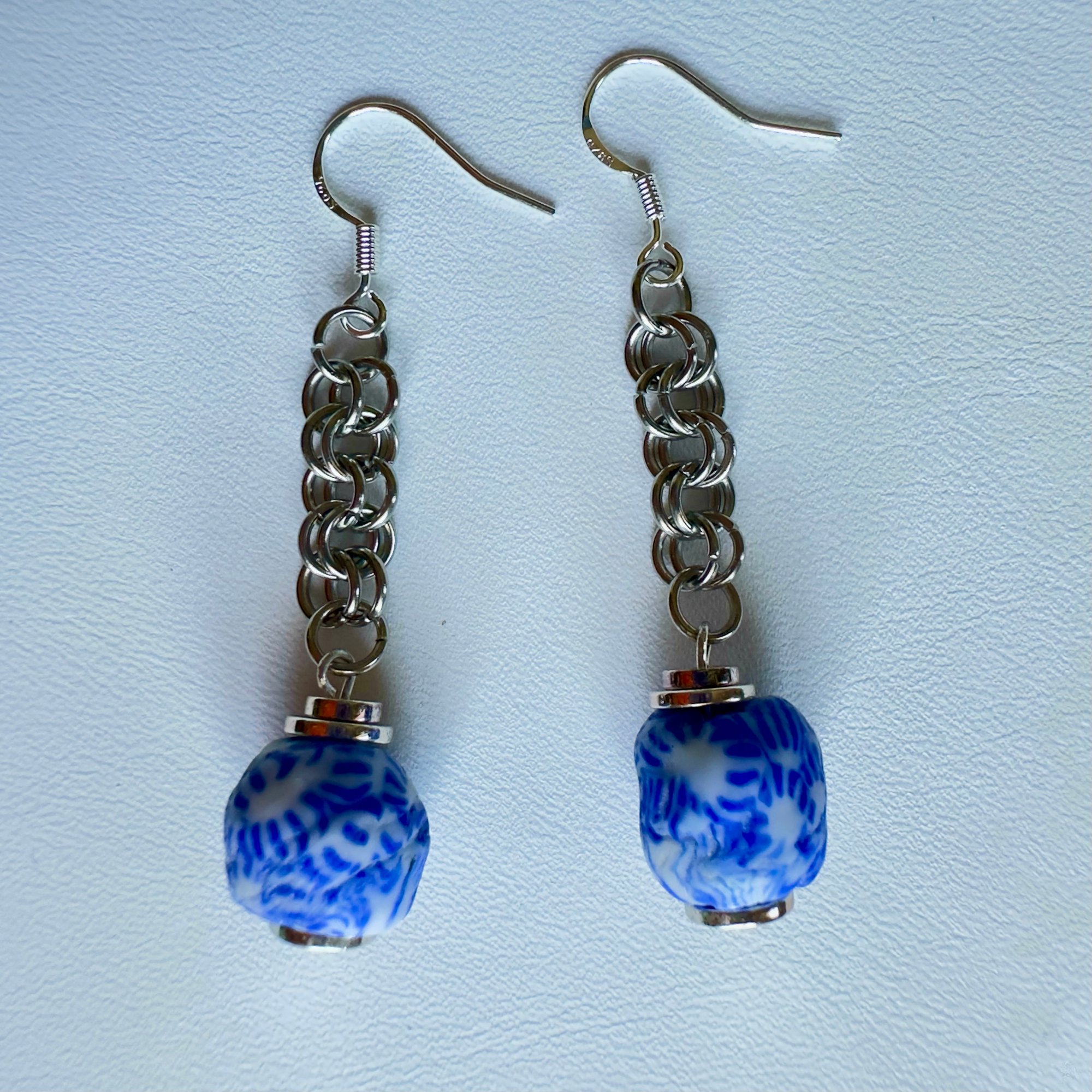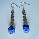 Blue and white fused recycled glass bead (11 mm) 1.5 inches long . Earwire ss.